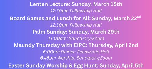Sunday Worship Service at 11:00 AM. in-person, via Zoom, and on YouTube.